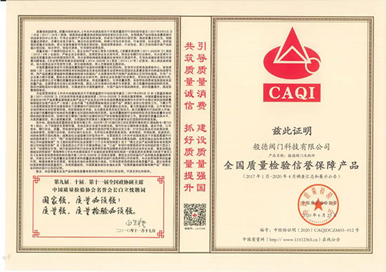 般德閥門榮獲CAQI“全國閥門行業質量領先品牌”、“全國閥門行業質量領先企業”、“全國質量檢驗信譽保障產品”。