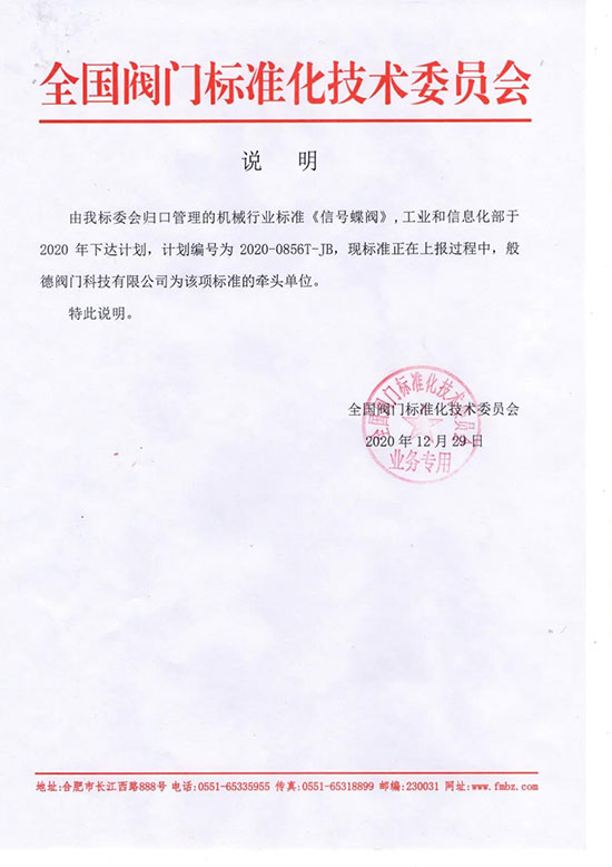 般德閥門是機械行業標準《信號蝶閥》的牽頭單位,《工業閥門的逸散性試驗》、《通用閥門 不銹鋼鑄件技術條件》、《鐵制和銅制螺紋連接閥門》、《工業閥門 壓力試驗》四項標準的起草單位之一。