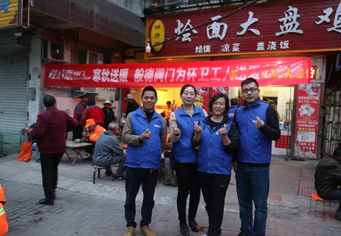 進入10月,天氣逐漸寒冷起來。為大力弘揚社會主義核心價值觀,充分彰顯城市文明,感謝環(huán)衛(wèi)工人每天為城市環(huán)境的辛勤付出,般德閥門承包了早餐店,為環(huán)衛(wèi)工人發(fā)放愛心早餐,給他們送去寒秋里的溫暖。