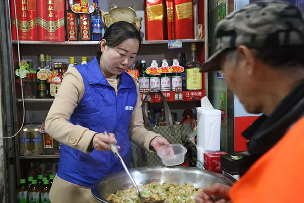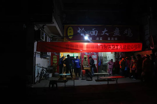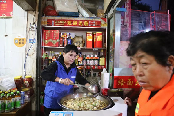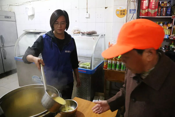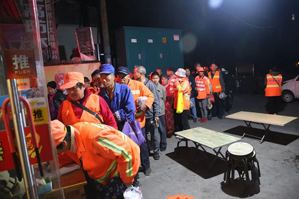 環(huán)衛(wèi)工人們穿著黃色的工作服,有秩序地排隊登記進店吃早餐,每個人都會對志愿者們說聲謝謝,他們沒有時間互相聊天,匆匆吃完飯就收拾東西奔赴工作地點,趕在城市“蘇醒”之前,讓城市的面貌煥然一新。志愿者們也都加快了手上的工作,盡量減少環(huán)衛(wèi)工人們的等待時間,早點吃上一口熱乎乎的早餐,不耽誤他們的工作。